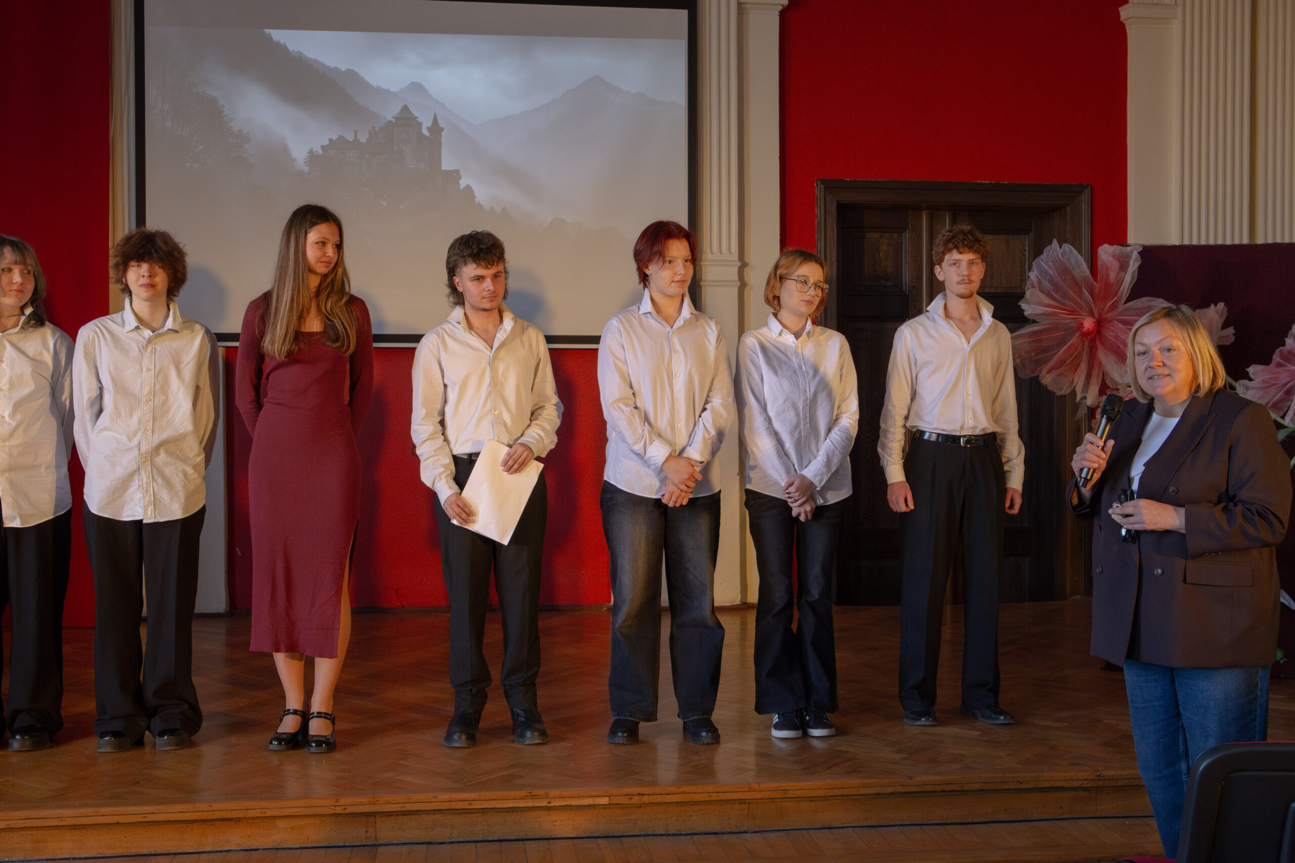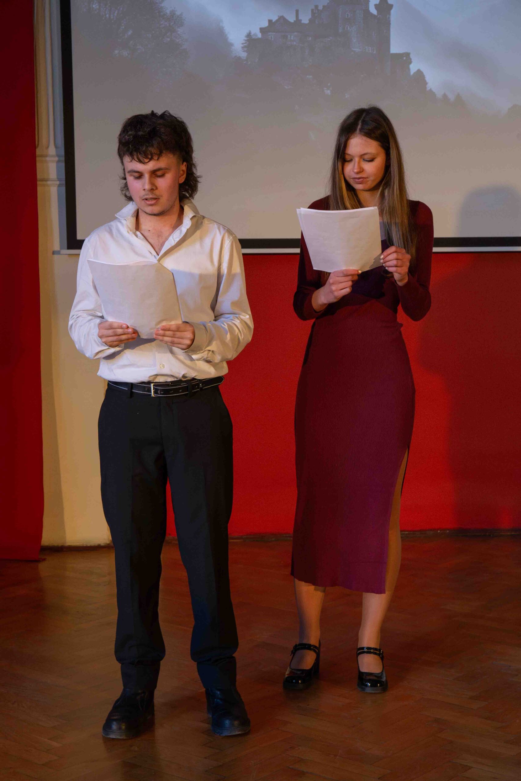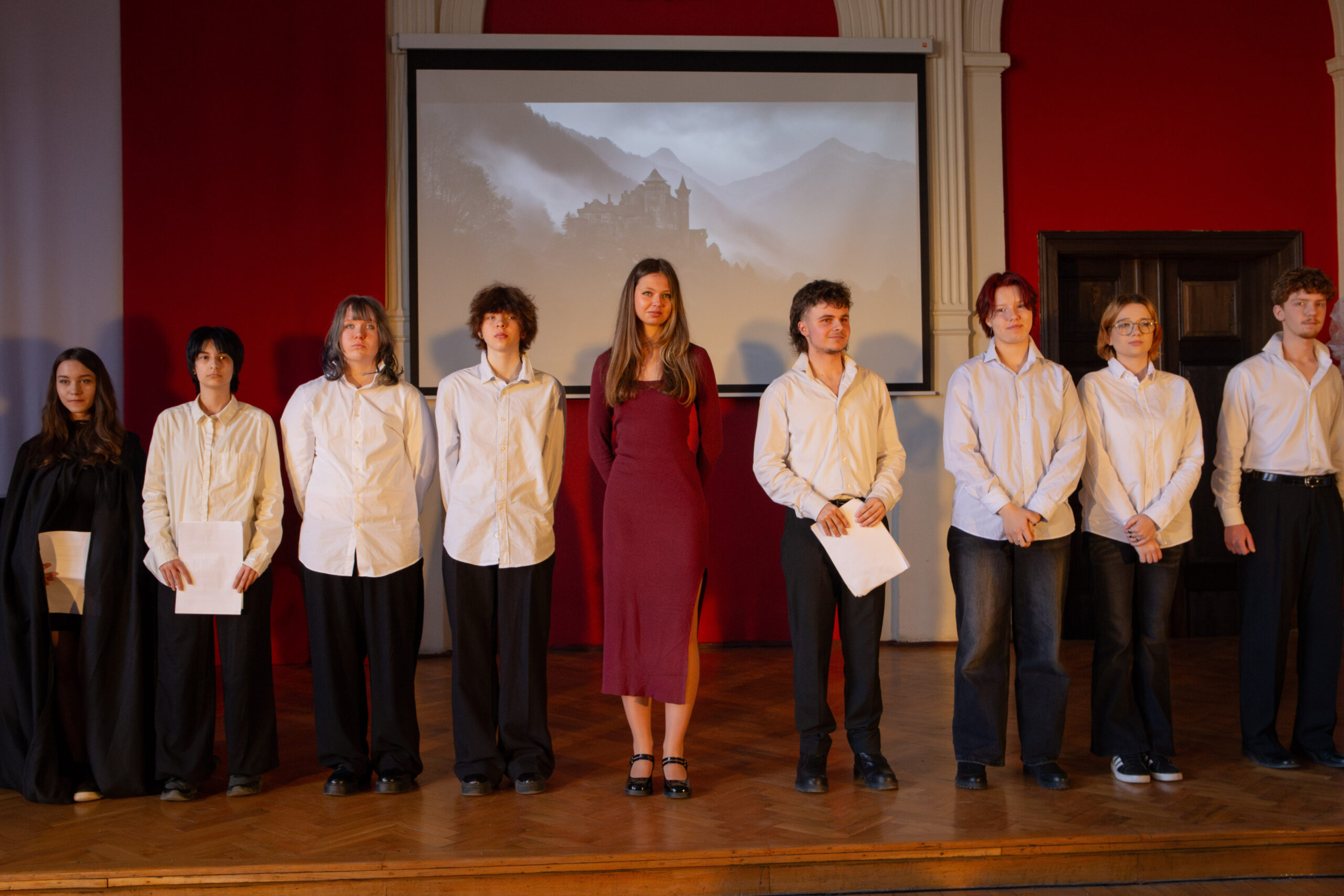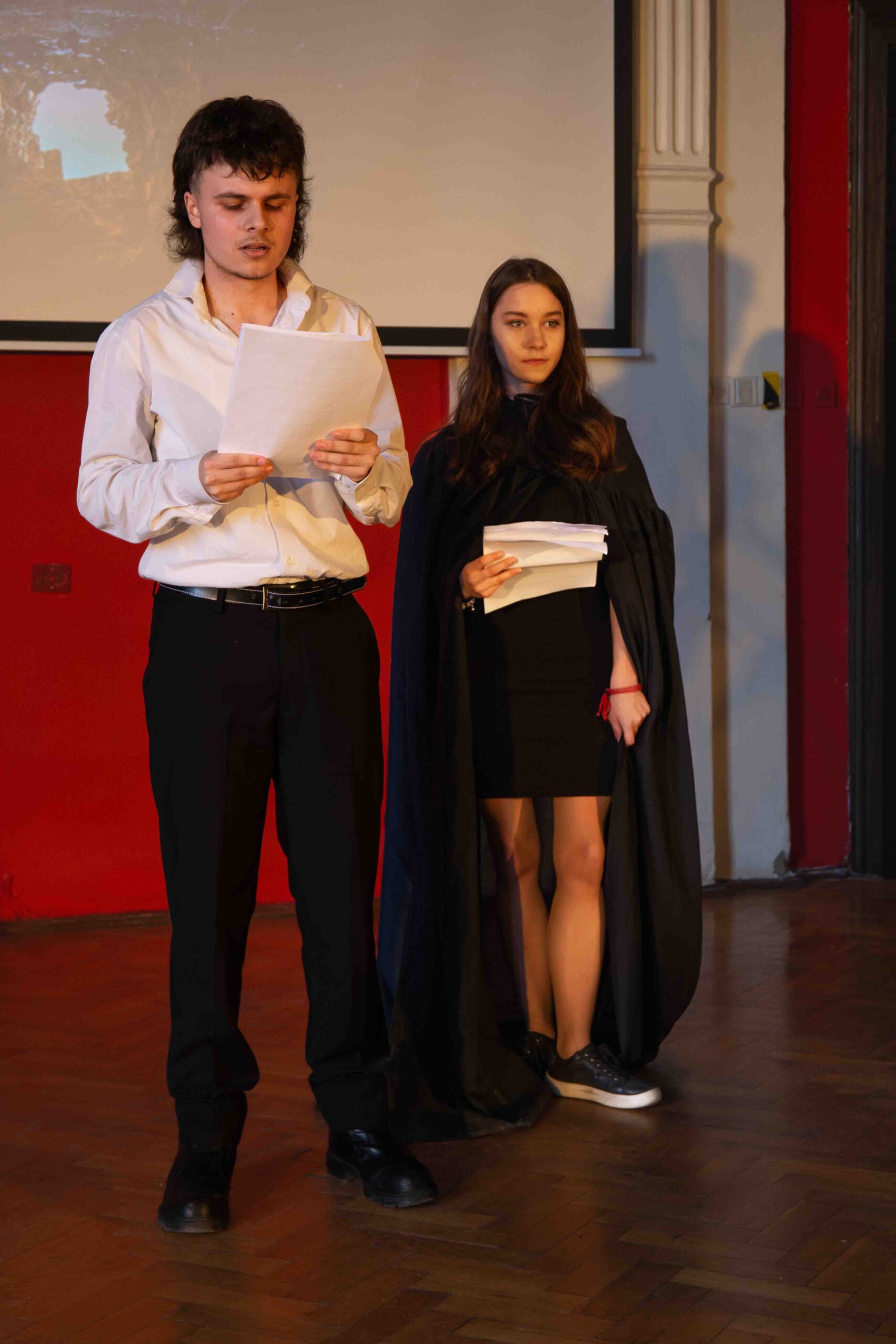 Szkolne Koło Teatralne przygotowało dla uczniów klas maturalnych adaptację jednego z najpopularniejszych dramatów Szekspira. Głośne czytanie sztuki z wykorzystaniem elementów gry aktorskiej okazało się dla wykonawców nie lada wyzwaniem, jednak po raz kolejny stało się okazją do pokonywania własnych słabości oraz kształtowania umiejętności współpracy z partnerem. Na scenie moglibyśmy zobaczyć uczniów klas czwartych, trzecich, a nawet pierwszych. Wyrazy uznania należą się zarówno dla „weteranów” sceny w Lelewelu, jak też debiutantów, którzy pierwszą tremę mają już za sobą. Po spektaklu aktorzy zaprosili maturzystów do rozmowy o problemach poruszonych w lekturze. Abiturienci chętnie dzielili się swoimi przemyśleniami. W dyskusji wzięła udział także Pani Dyrektor, która sprowokowała młodych ludzi do szukania uniwersalnych treści z Makbeta w naszej codzienności. Na koniec odtwórcy ról szekspirowskich postaci życzyli maturzystom pomyślności na egzaminach.